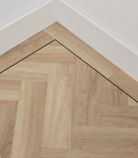 Om meteen met de deur in huis te vallen, niet alle vloeren kunnen worden voorzien van een band en een bies. We zien deze unieke uitstraling steeds vaker bij pvc patroonvloeren zoals visgraat en Hongaarse punt. Een band en bies gaan dan ook perfect samen met plak pvc vloeren, maar het is niet mogelijk om click pvc vloeren te voorzien van een band en bies. Dit komt doordat een klik pvc vloer uit unieke linker- en rechterplanken bestaat die geen extra verbinding hebben voor een band rondom de vloer. Ook laminaat vloeren kunnen om dezelfde reden helaas niet voorzien worden van een band en een bies.