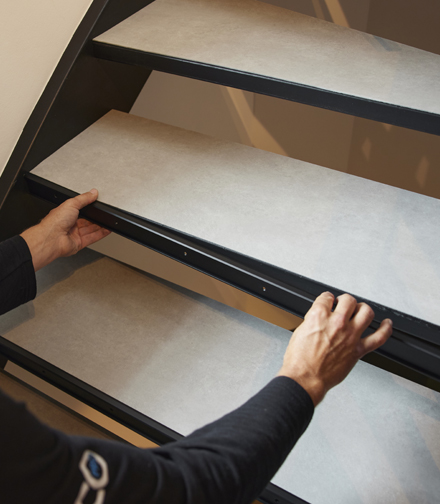 Een trap met schuine traptreden is echter iets moeilijker. Bij Floorlife raden we aan om hiervoor een trapspin te gebruiken om het formaat vast te stellen. Na het opmeten van de traptreden kun je de rechte of schuine treden op maat zagen en deze aan de huidige traptreden te lijmen. Easy!